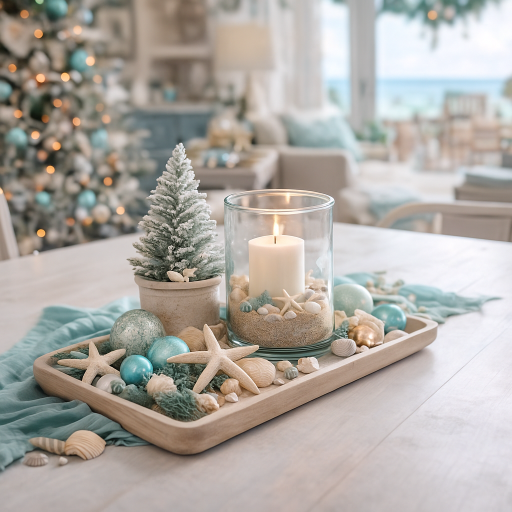 This look blends holiday charm with relaxing coastal vibes, perfect for Florida homes or anyone who loves the beach. The soft blues and natural textures create a calming, elegant holiday moment.