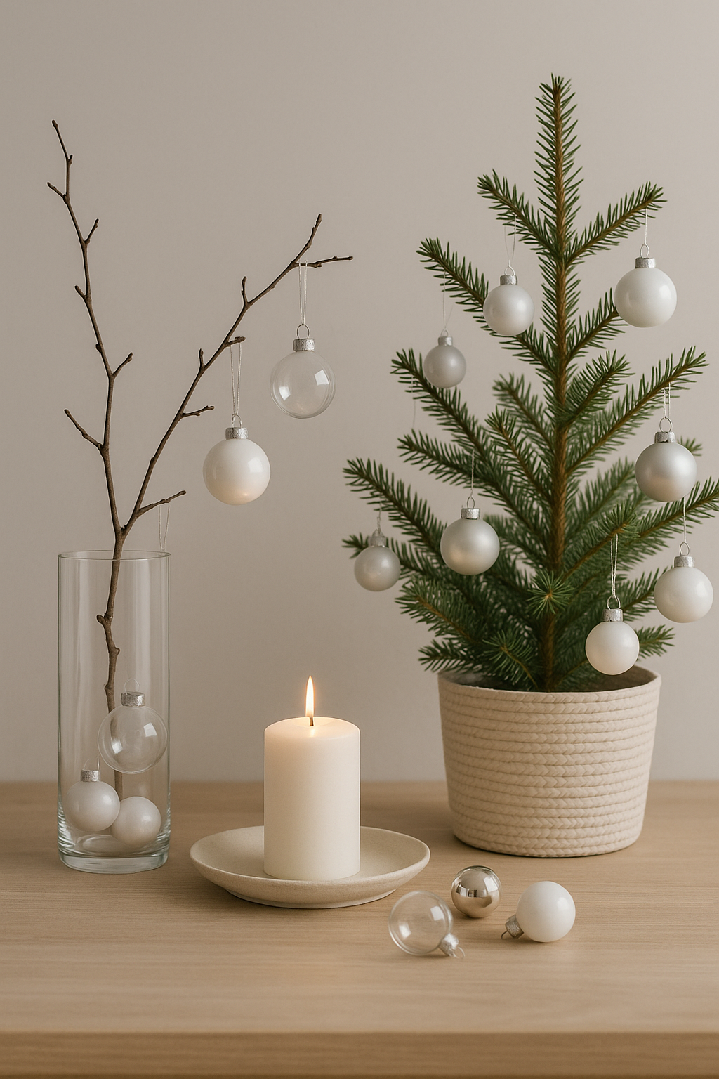 If you love a clean and modern aesthetic, try decorating with minimalist touches. Clear ornaments hung from bare branches, soft candlelight, and neutral greenery create a calm and beautiful holiday look.