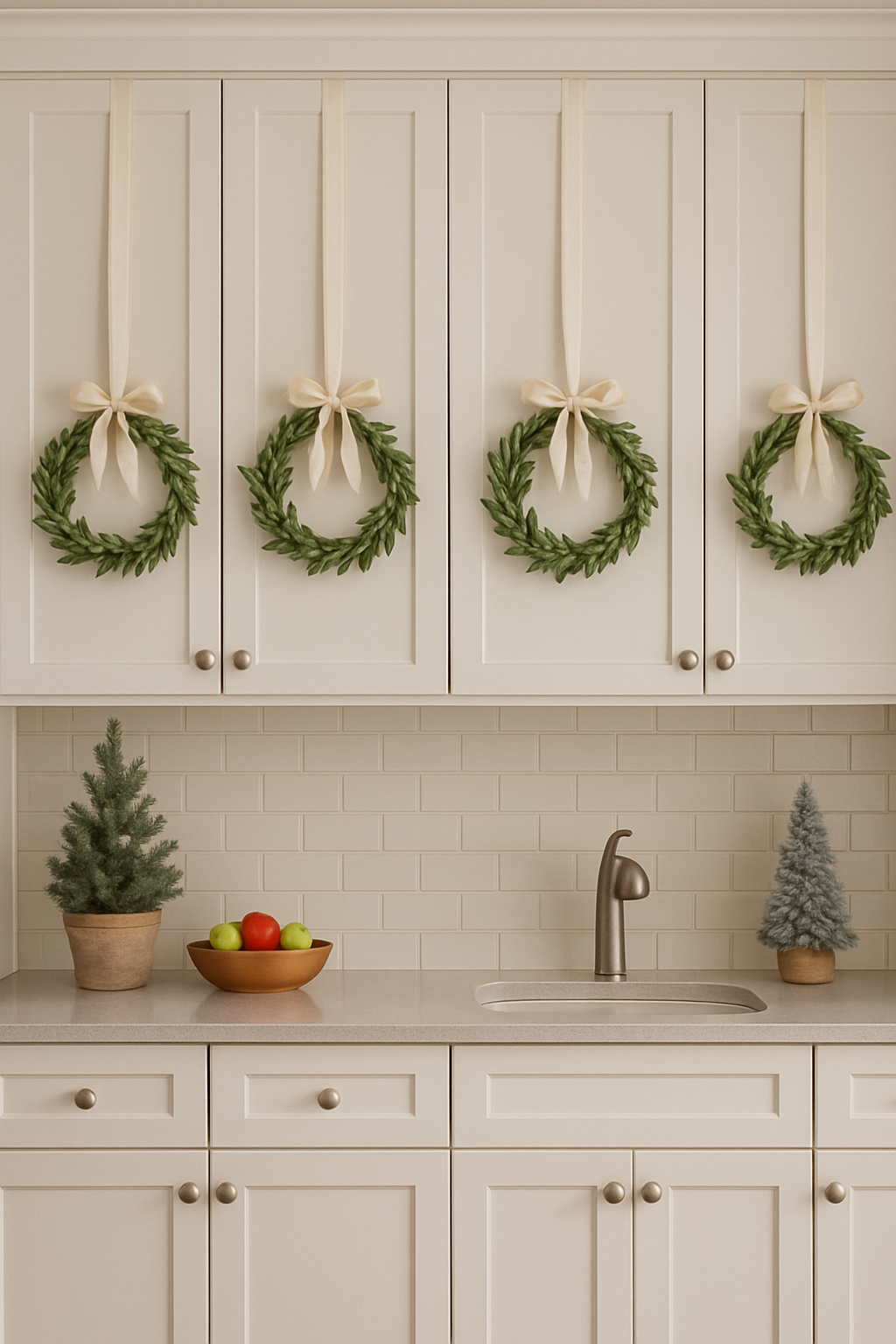 Simple wreaths hung from cabinet doors bring instant charm to a kitchen. Small countertop trees and greenery can transform everyday spaces into holiday ready areas.